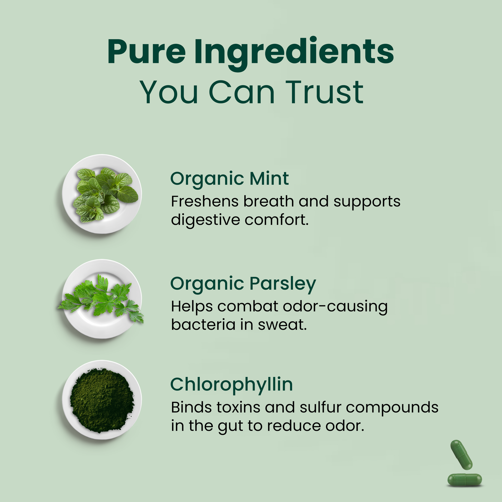Parmint™ tackles body odors at the source while simultaneously promoting a healthy gut. Our powerful, all-natural formula gently helps cleanse the body from within by working to absorb the toxins in your system before they are excreted through the skin and breath.